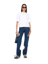 Structured denim pants with avant-garde cut-out detailing, epitomizing the fusion of urban streetwear and high fashion. - Innovative circular cut-out design - Classic five-pocket construction - Wide-leg silhouette - Mid-rise waist - Reinforced stitching for durability - Signature logo patch at rear - Concealed front button fastening - Raw-edge hem detail DETAILS - Fabric: 100% Cotton - Code: OWYA06AF25DEN0024400