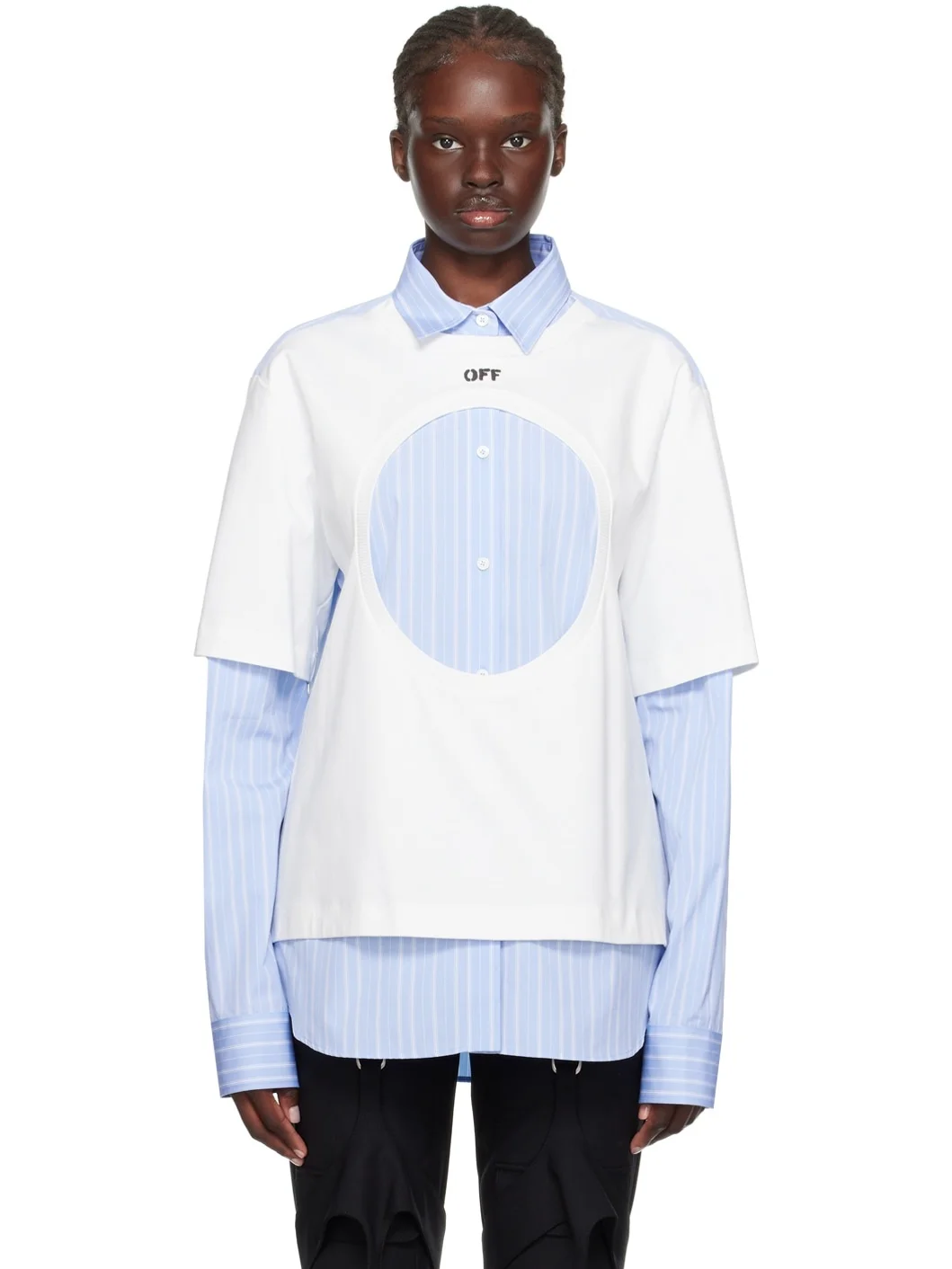 Cotton poplin and cotton jersey shirt. Stripes throughout. · Layered construction · Spread collar · Rib knit crewneck · Button closure · Logo printed at chest · Cutout at front Supplier color: White light blue