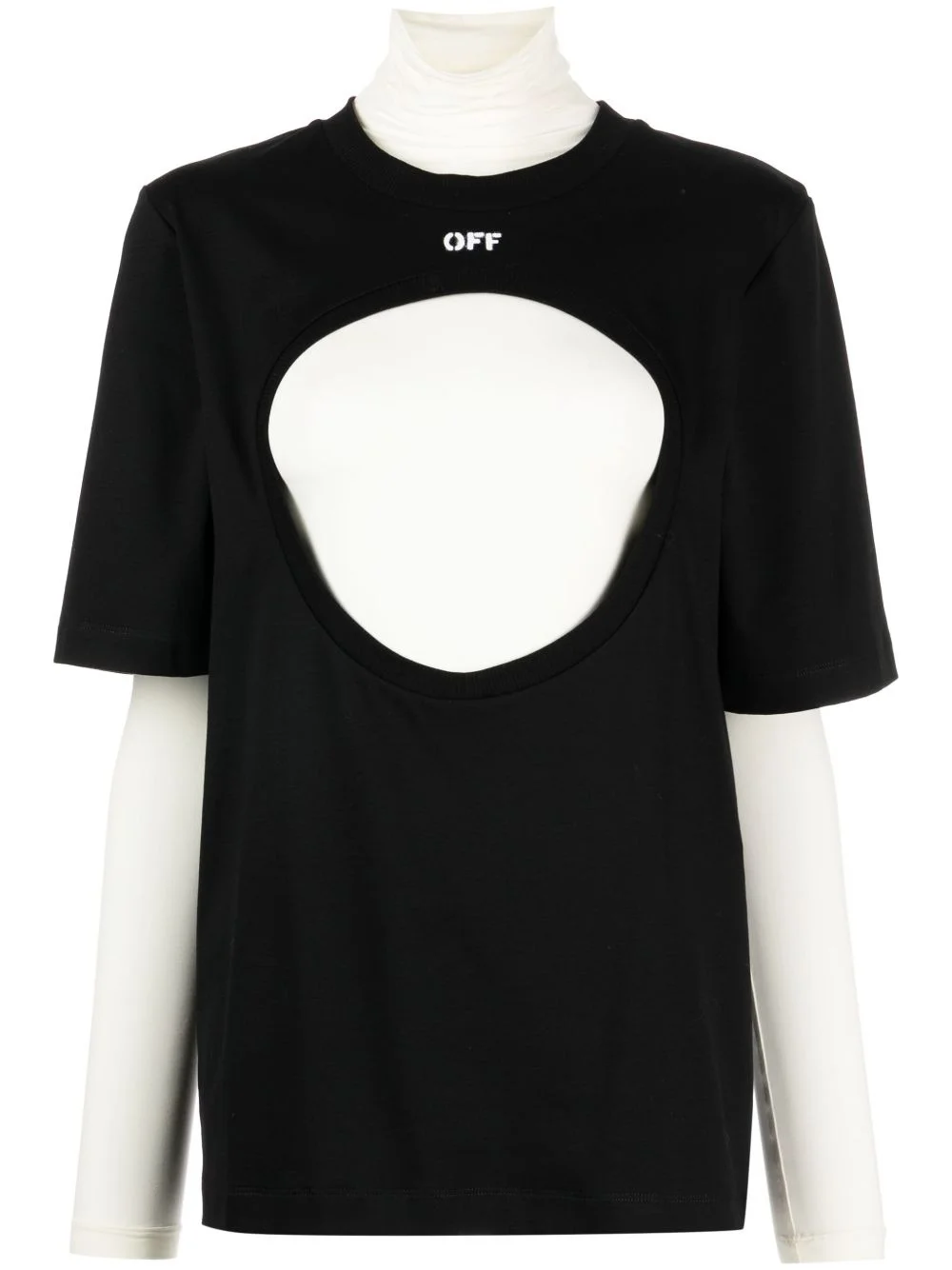 Meteor layered cotton T-shirt An iconic example of Off-White's singular aesthetic, the Meteor motif takes centre stage with this cotton T-shirt. The layered design features a singular cut-out on the front, exposing the contrasting interior, while a small logo print finishes the look. Highlights - Black/cream white - Cotton - Layered design - Signature meteor cut-out detailing - Logo print to the front - High neck - Long sleeves - Straight hem Made in Italy Composition Outer: Polyamide 87%, Elastane 13% Cotton 100% SIZE & FIT Model measurements Height 5 ft 10 in(1.77 m) Bust/Chest 31.49 in(80 cm) Hips 35.43 in(90 cm) Waist 25.19 in(64 cm) FittingInformation Designed for a slim fit that sits just away from the body offering a close yet comfortable fit Made from a midweight stretch fabric, this piece offers elasticity and flexibility when worn This piece fits true to size – take your usual size Washing instructions Hand Wash