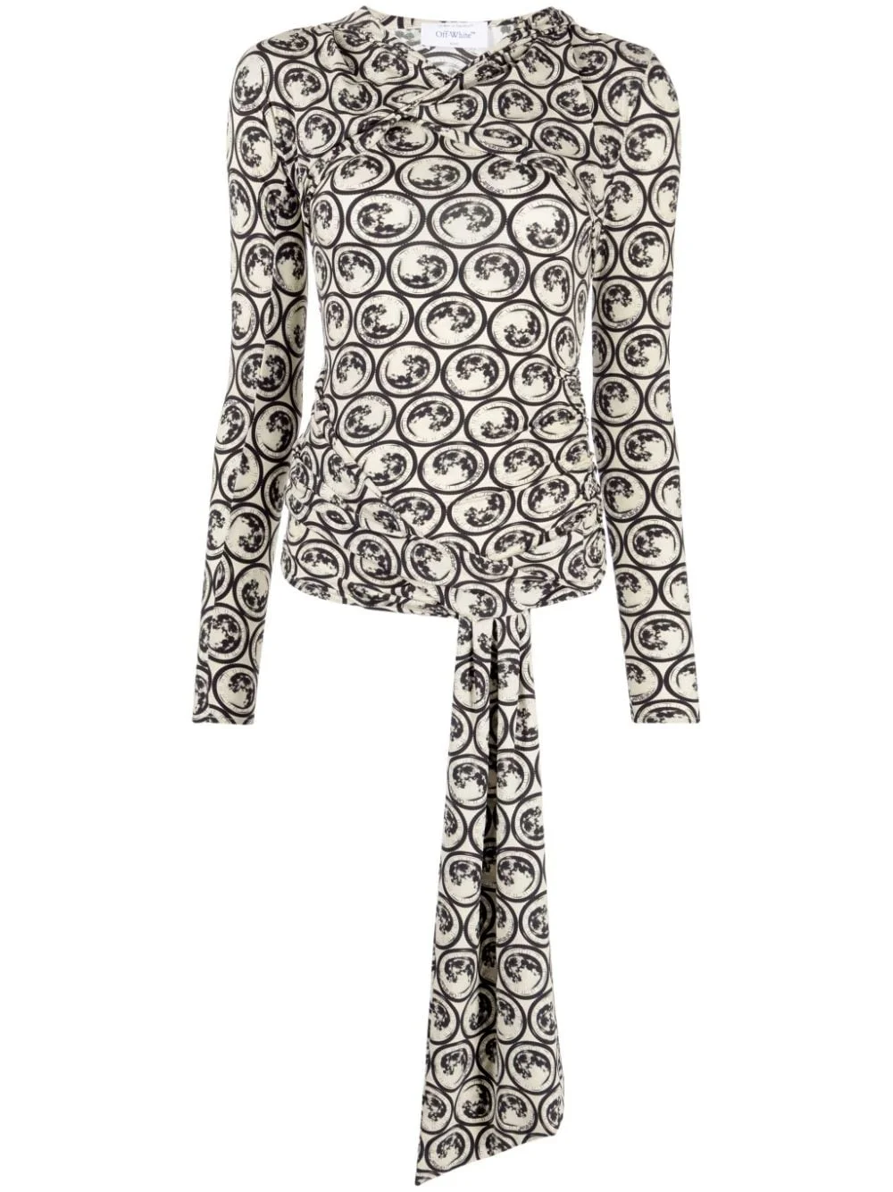 motif-print long-sleeve top Contemporary yet timeless, this Off-White top fits in with current maximalist trends through a two-tone colourway and all-over motif print. Highlights - Black - Motif print - Round neck - Long sleeves Made in Italy Composition Polyamide 87%, Elastane 13% Washing instructions Machine Wash