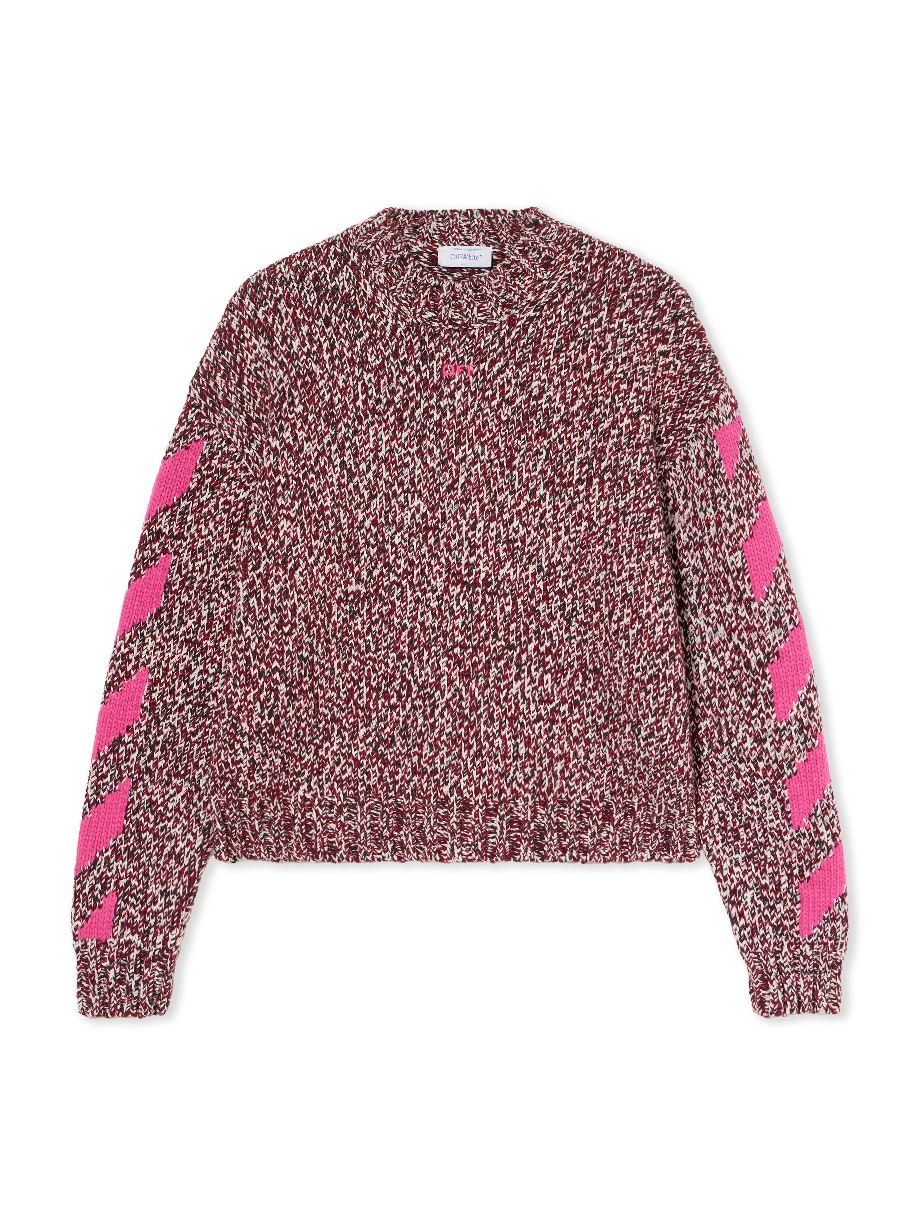 Expertly crafted, the Mouline Arrow Knit Crewneck Sweater from Off-White™ features a distinctive mouline knit texture, accentuated by the iconic arrow motif. - Richly textured mouline knit - Signature arrow motif on the rear - Long sleeves with chevron detailing - Ribbed crewneck and hem for structured fit - Elevated urban aesthetic - Made in Italy DETAILS - Material: 100% Wool - Code: OWHE10JF25KNI0012632