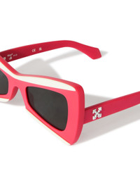 Red and white sunglasses featuring white arrows at side. Butterfly shape and dark grey lens. Logo engraved on the lens. MATERIALS 100% Acetate FITTING Bust 0cm Height 0cm Hips 0cm Waist 0cm