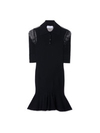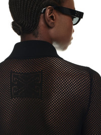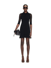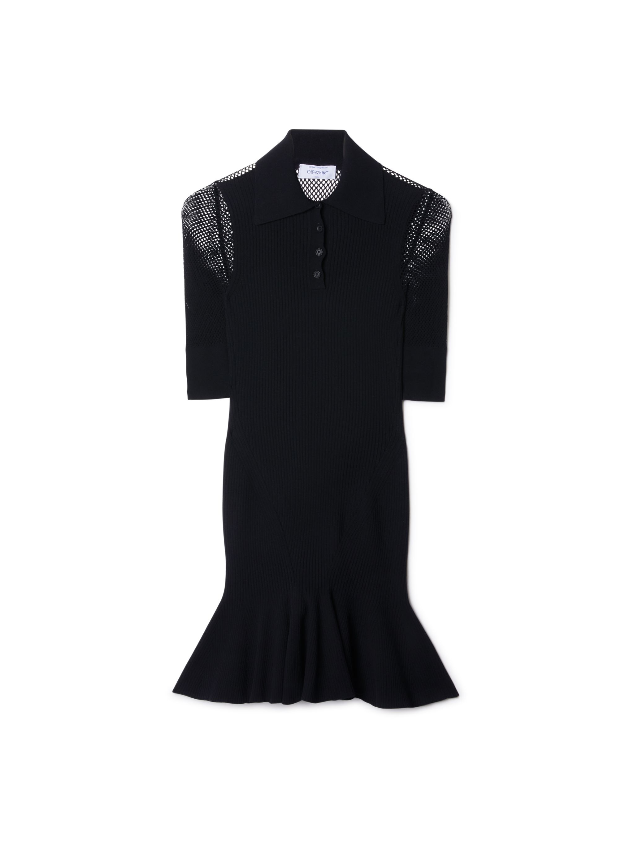 This fitted knit mini dress features a polo-style collar and gently flared pleat skirt. The sleeves and back are constructed from mesh. It is completed with an arrow logo at the nape. Made in Italy. MATERIALS 1% Polyurethane 28% Polyester 64% Viscose 7% Polyamide FITTING Model Diara Wade wears size 40 Height: 5’ 11" (180 cm) Waist: 24” (62 cm) Hips: 34” (88 cm)