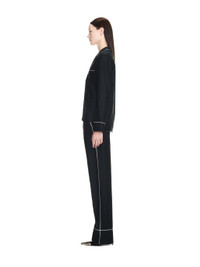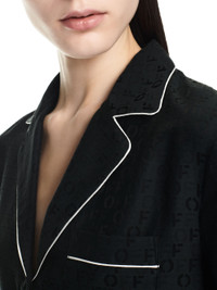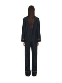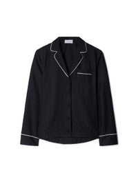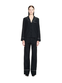 Black pajama shirt featuring white lines details. Flat pocket at front. Spread collar with white line details. Regular fit. MATERIALS 44% Cotton 56% Silk FITTING Model Ikra Ismail wears size 42 Height: 5’ 10" (178 cm) Chest: 31“ (79 cm) Waist: 24” (61 cm)