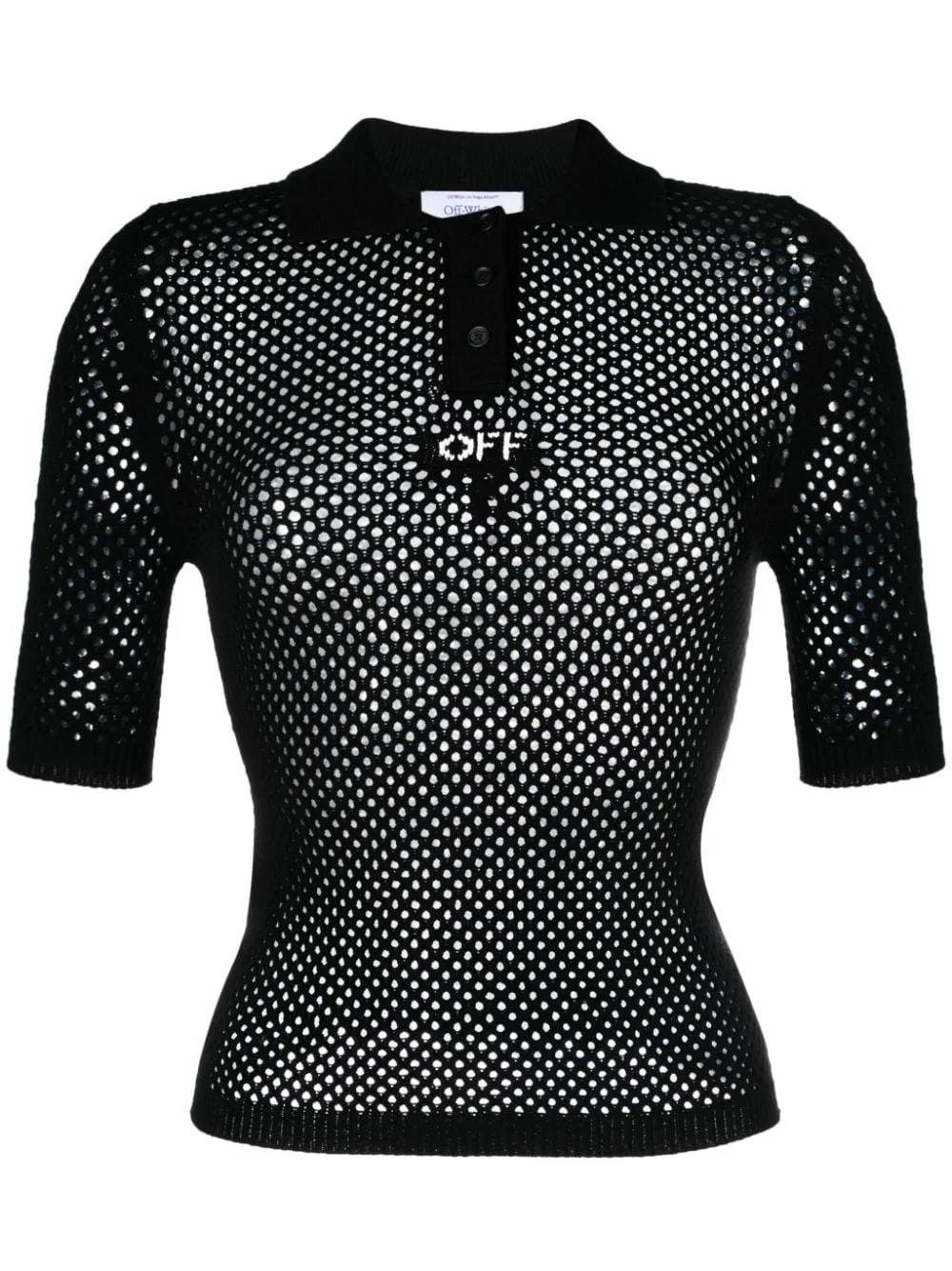 OFF-logo open-knit polo shirt Showcasing sportswear-inspired minimalism, Off-White presents this black top which is characterised by its open-knit construction. Centred at the chest is an intarsia OFF logo. Highlights - Black - Open knit - Intarsia-knit logo - Spread collar - Front button placket - Short sleeves - Straight hem Made in Italy Composition Viscose 70%, Polyester 30% Washing instructions Dry Clean Only