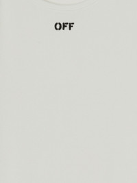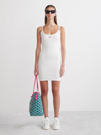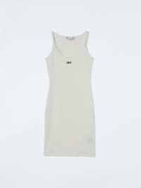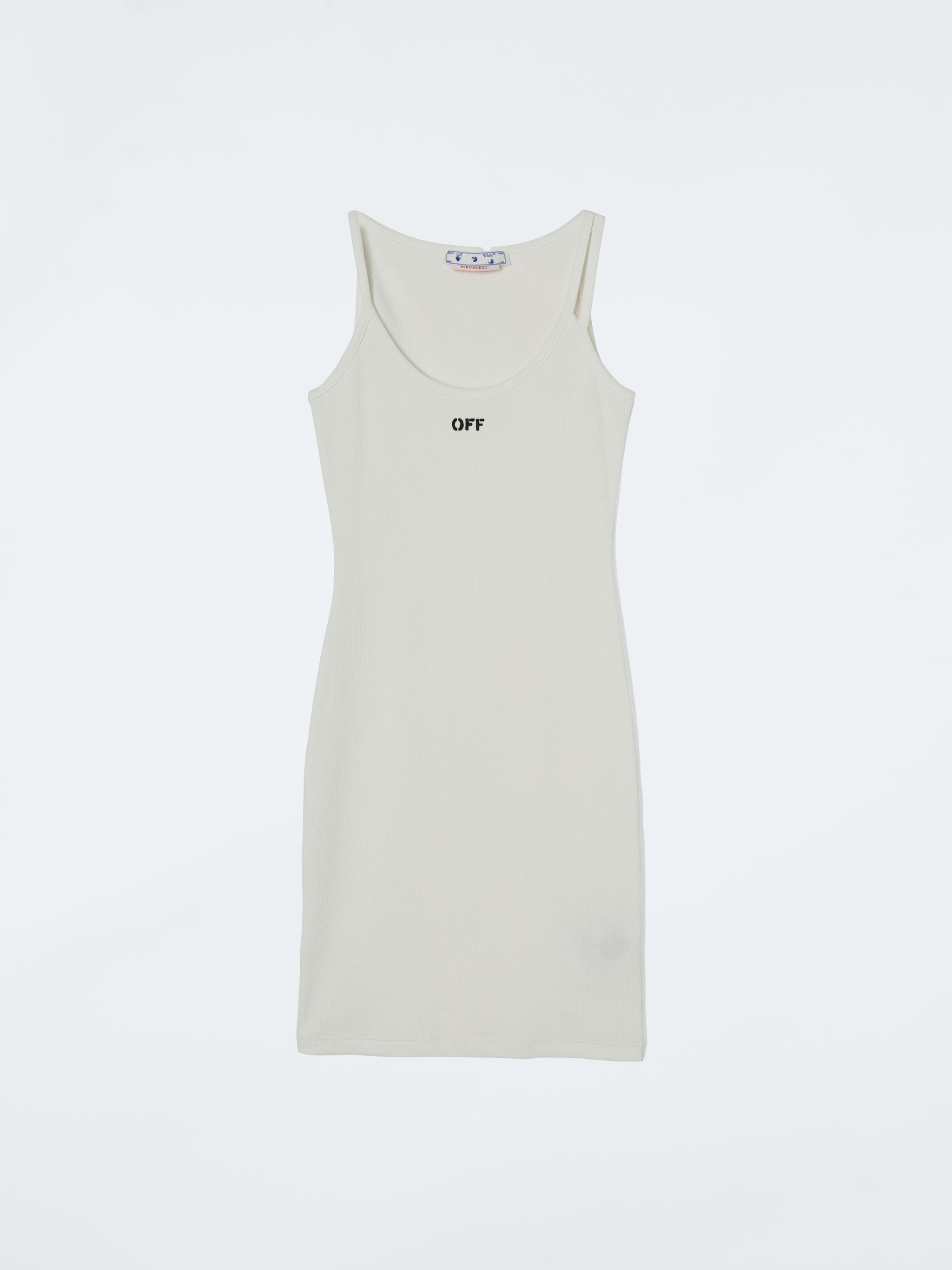 Sleeveless mini dress in white with "OFF" printed in black at front. Tonal shoulder straps. MATERIALS 95% Cotton 5% Elastane FITTING Model Silvia wears size S Height: 6’ (179 cm) Chest: 31“ (85 cm) Waist: 24” (61 cm)