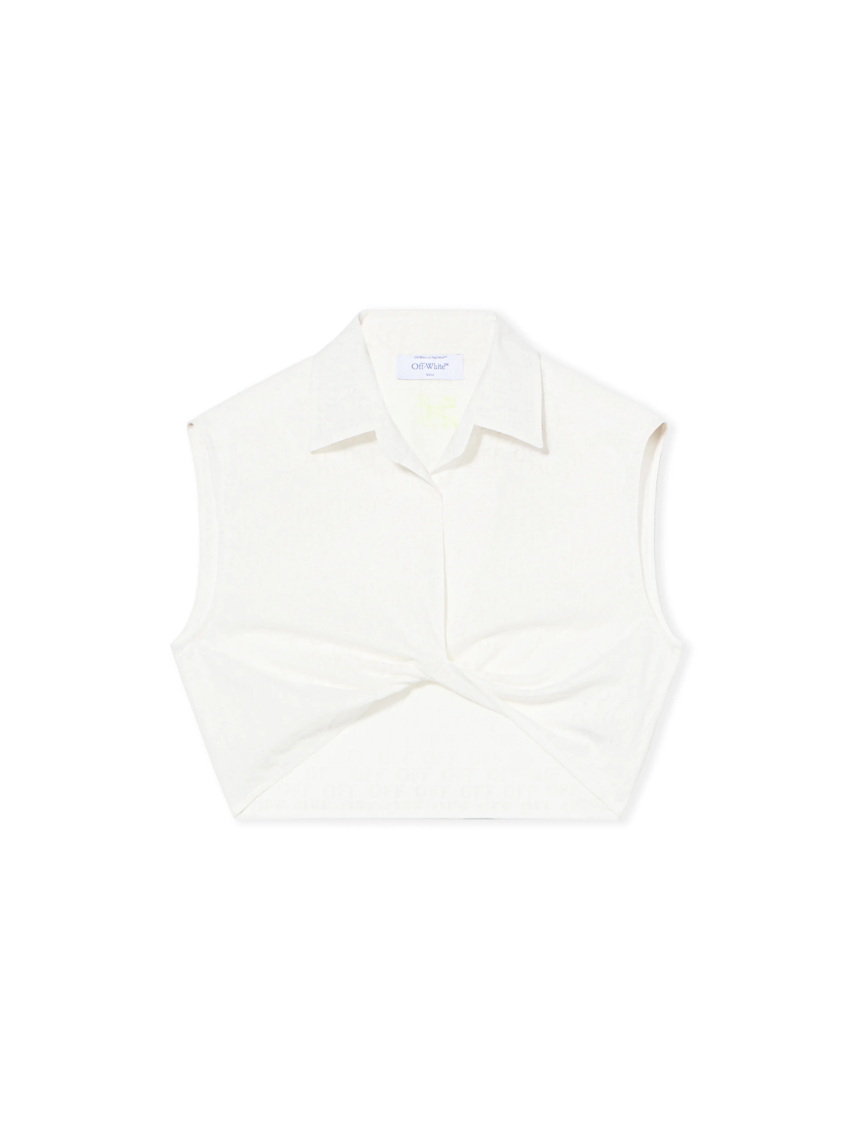 <p>This refined sleeveless shirt from Off-White™ seamlessly blends urban style with technical elegance, featuring a subtle twist detail that adds architectural interest.</p><ul type="circle"><li>Sleeveless shirt crafted from lightweight fabric</li><li>Distinctive twist detail at front</li><li>Point collar for a structured neckline</li><li>Straight hemline offering a clean finish</li><li>Designed with signature Off-White™ brand detailing</li></ul> DETAILS - Fabric: 53% Polyester, 47% Cotton - Code: OWGA09ET25FAB0020118
