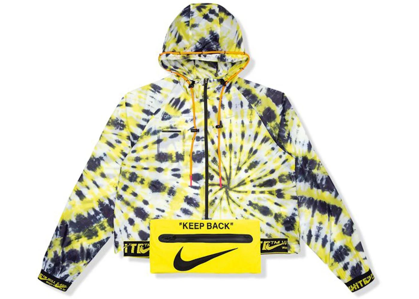 The OFF-WHITE x Nike Women's NRG AOP Jacket Volt is a hooded nylon jacket featuring a zip front rendered in tie-dyed print fabric. Volt's yellow hue blends with shades of black and white. OFF-WHITE and Nike Swoosh branding appears on the cuffs and the included waist pack. Additional OFF-WHITE branding appears on the right chest and as a laser-cut design on the back. The fashion house OFF-WHITE was launched by Virgil Abloh, whose career and designs garnered attention after he interned with Kanye West at Fendi in 2009. OFF-WHITE collaborated with American sportswear giant Nike several times, resulting in fashion-driven athletic wear bearing the hallmarks of Abloh's designs, such as the outward-pointing arrow motif subtly included on the back of the AOP Jacket. The best feature of the NRG AOP Jacket is its Volt print, which makes this running jacket a versatile, stylish piece. The OFF-WHITE x Nike Women's NRG AOP Jacket Volt was released on December 12, 2019, and retailed at $300. - Season FW19 - Color Volt - Release Date 2019-12-12 - Retail Price 300 - Featured false