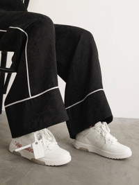 "White OUT OF OFFICE sneakers featuring brown “FOR WALKING” text and white arrow on the side. Off-White™ logo on the back. White and beige rubber sole. White lace-up closure. Virgil Abloh—Off-White’s founder and creative director—wanted to create a tennis shoe with a late 1980’s and early 1990’s aesthetic, that could be worn all-day-every-day. The result: a low-top silhouette with hybridized street, basketball and running influences. The “OUT OF OFFICE” sneaker features a contrasting outsole with translucent gel insets, classic perforated toe vamps, a ribbed heel and a recontextualized logo." MATERIALS Outer: 89% Leather Lining: 14% Leather Outer: 11% Polyester Lining: 86% Polyester Sole: 100% Rubber FITTING Bust 0cm Height 0cm Hips 0cm Waist 0cm