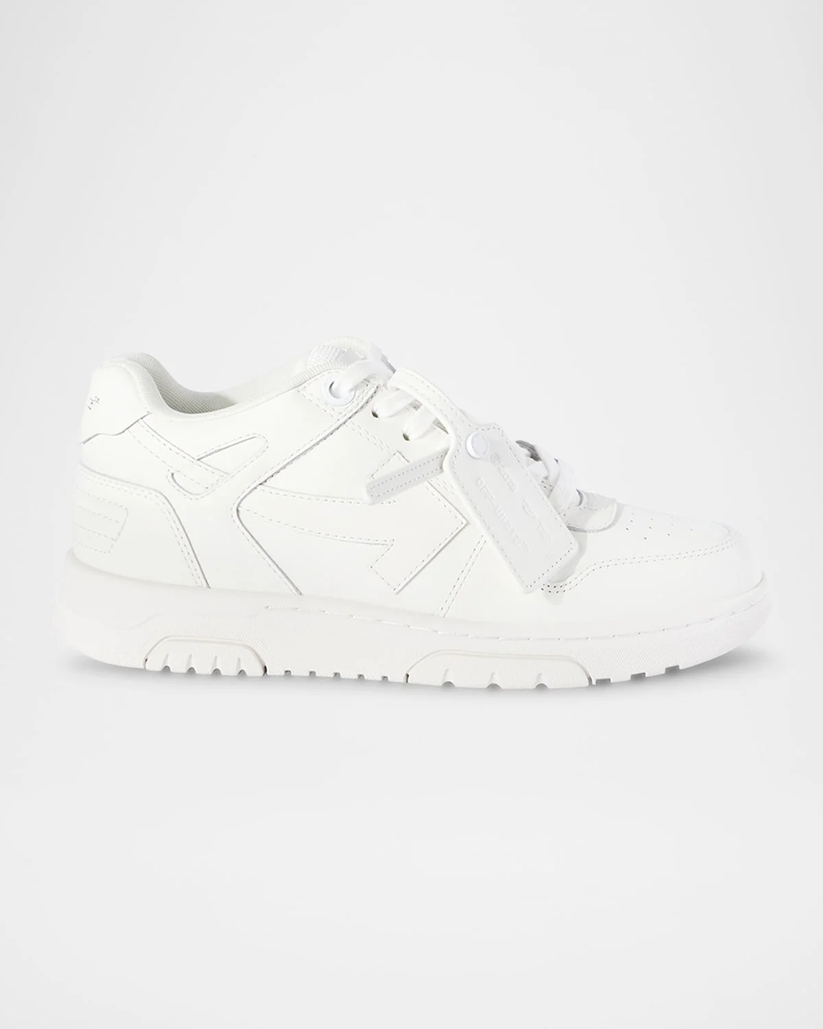 - Off-White "Out of Office" runner sneakers in calf leather and polyester. - Flat heel. - Perforated round toe. - Lace-up vamp. - Signature arrow applique at sides. - Signature leather tag at sides. - Rubber sole. - Made in Italy.