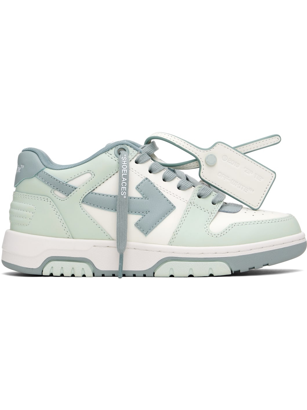 Low-top buffed calfskin sneakers in white and green. · Perforations at toe · Signature zip-tie at lace-up closure · Logo patch at padded mesh tongue · Padded collar · Arrow applique at sides · Logo embossed at heel tab · Pique lining · Treaded rubber sole Supplier color: White/Greyish green