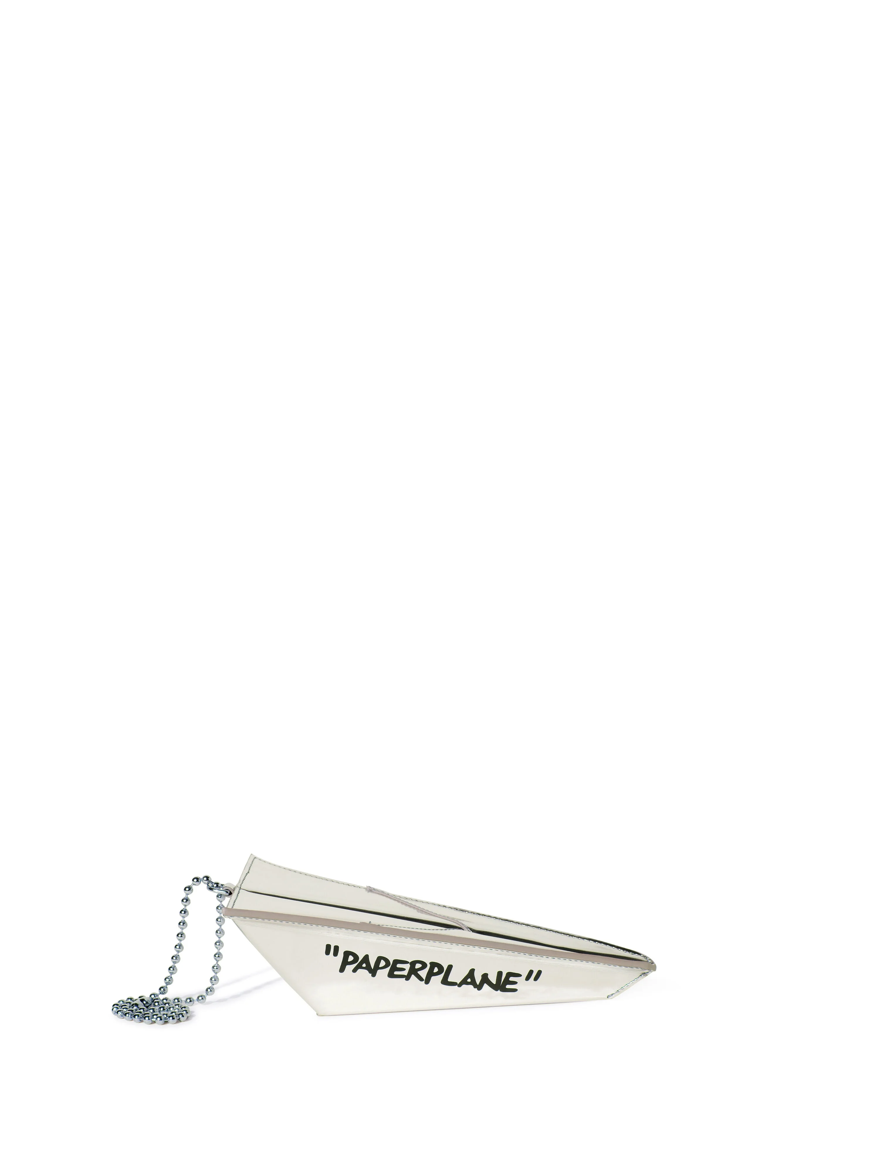 Part of the SS25 "DUTY FREE" runway collection, this paper plane-shaped clutch features a silver finish, a signature quote and ball-chain strap. Made in Italy. DETAILS - Weight: 116 g Measurements: Height 7 cm;Width 15,5 cm;Depth 24 cm - Code: OWNM057Z25FAB0017210