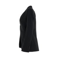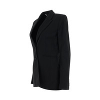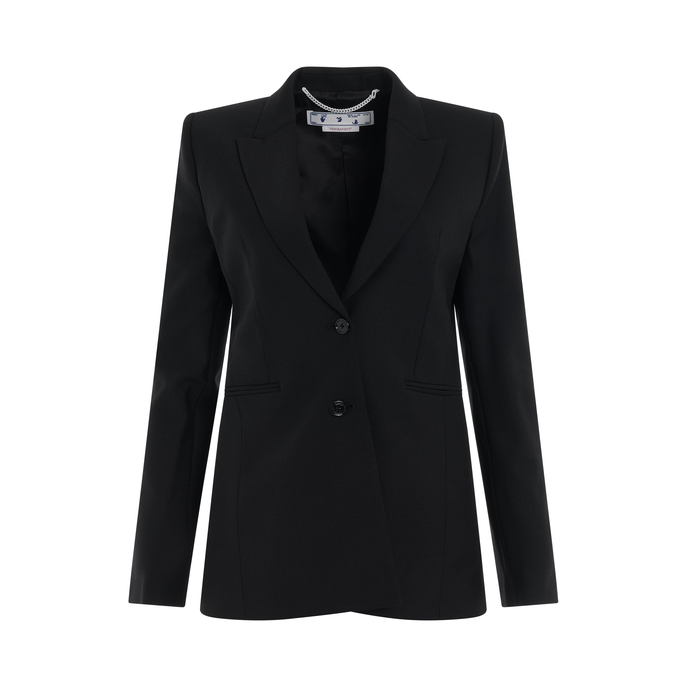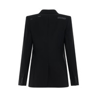 Long sleeves black single-breasted blazer perfectly exemplifies Off-White's ability to blend streetwear-inspired aesthetics with timeless silhouettes. Crafted in Italy from a delicate blend of virgin wool, this piece showcases impeccable tailoring and a refined fit. To add a unique touch, the blazer is adorned with a lettering embellishment at the rear, further enhancing its distinctive appeal together with two front pockets. • Composition: Outer: Polyester 53%, Virgin Wool 43%, Spandex/Elastane 4%. Lining: Viscose 53%, Cupro 47% • Long sleeves • Single breasted blazer • Tailored fit • Lettering embellishment SKU: OWEF061C99FAB0021001