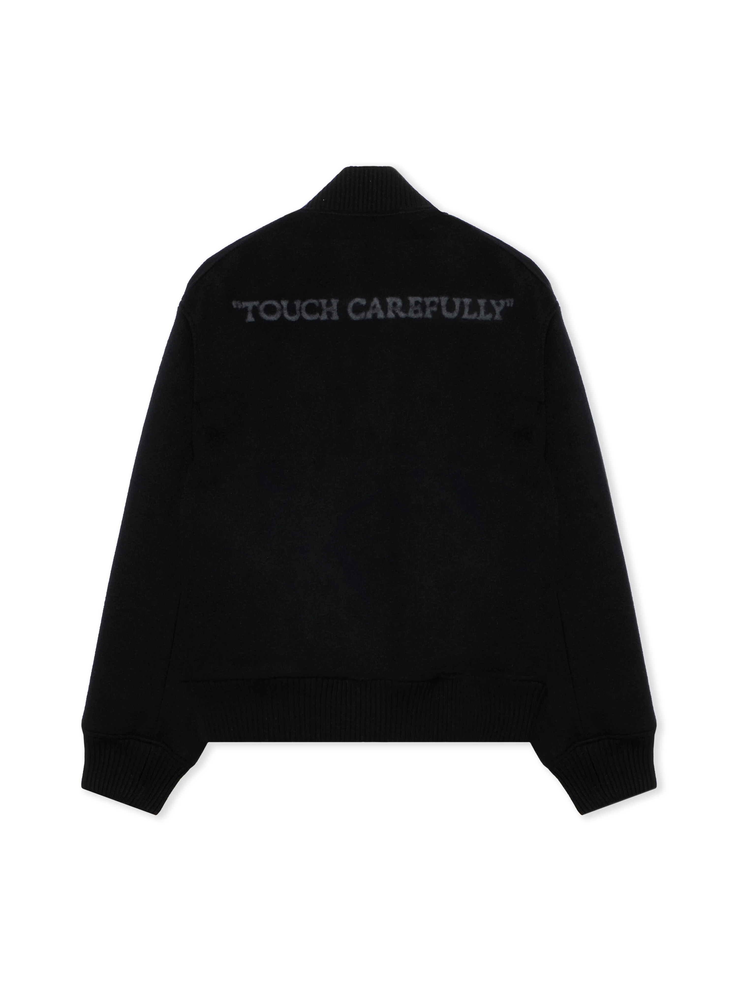 Structured bomber jacket in soft wool with ribbed trims and signature quote detail. - Ribbed collar and cuffs - Front zip fastening - Side flap pockets - Quote detail at back - Ribbed hem for snug fit DETAILS - Code: OWEH031F25FAB0011007