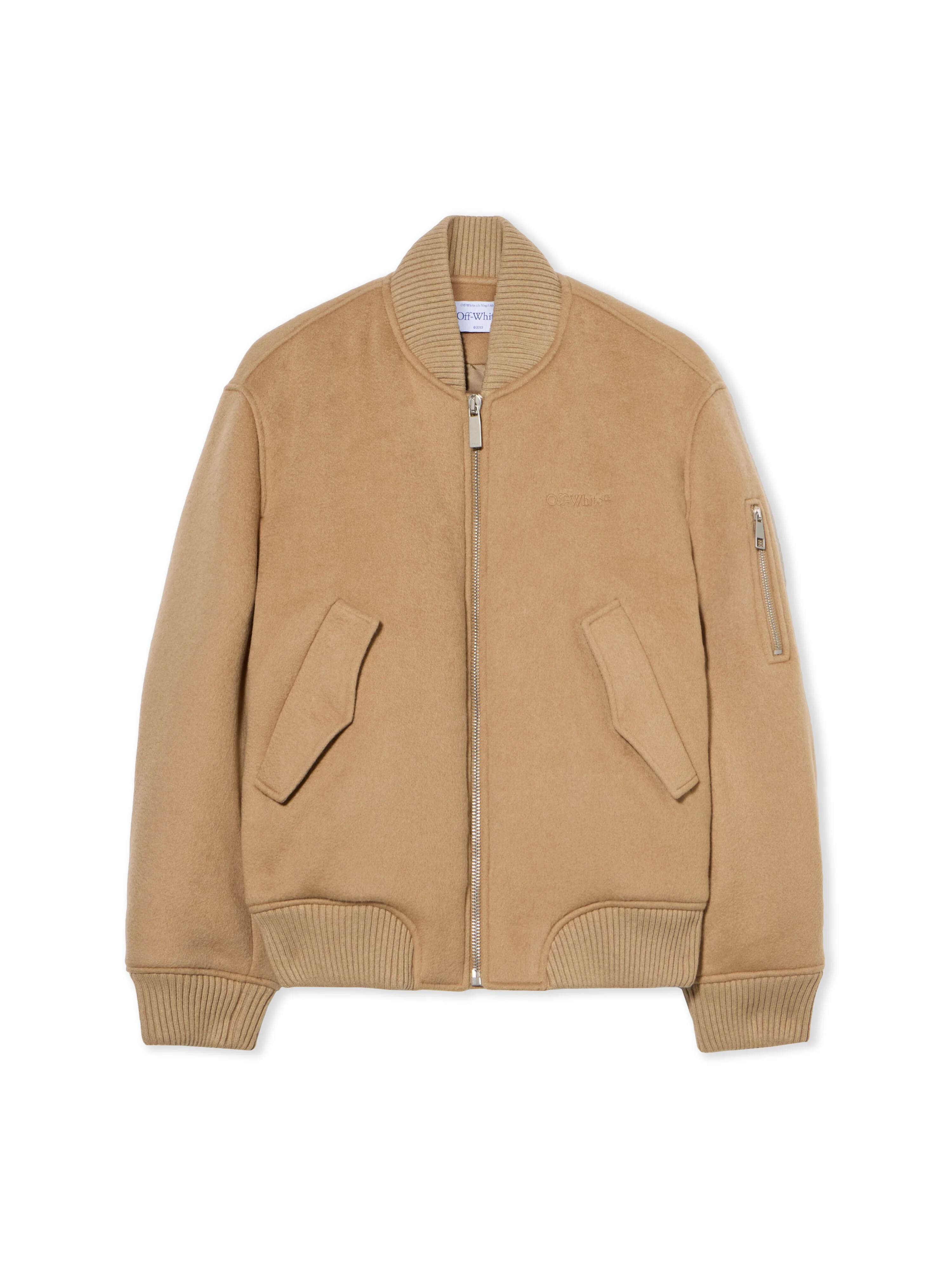 Wool-blend bomber jacket featuring ribbed knit trims and rear text detail. - Ribbed knit collar and cuffs - Front zip fastening - Long sleeves with zip pocket - Side flap pockets - Rear text feature DETAILS - Material: 100% Cashmere - Code: OWEH031F25FAB001626D