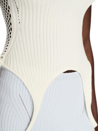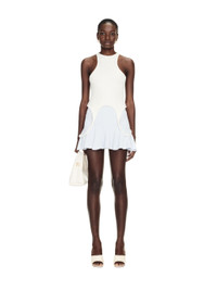 This fitted racerback mini dress features a ribbed knit top with strap details at the waist and a tonally contrasting skirt with gentle pleats. The reverse of the dress is constructed from mesh. Made in Italy. MATERIALS 27% Polyester 1% Elastane 8% Polyamide 64% Viscose FITTING Model Diara Wade wears size 40 Height: 5’ 11" (180 cm) Waist: 24” (62 cm) Hips: 34” (88 cm)