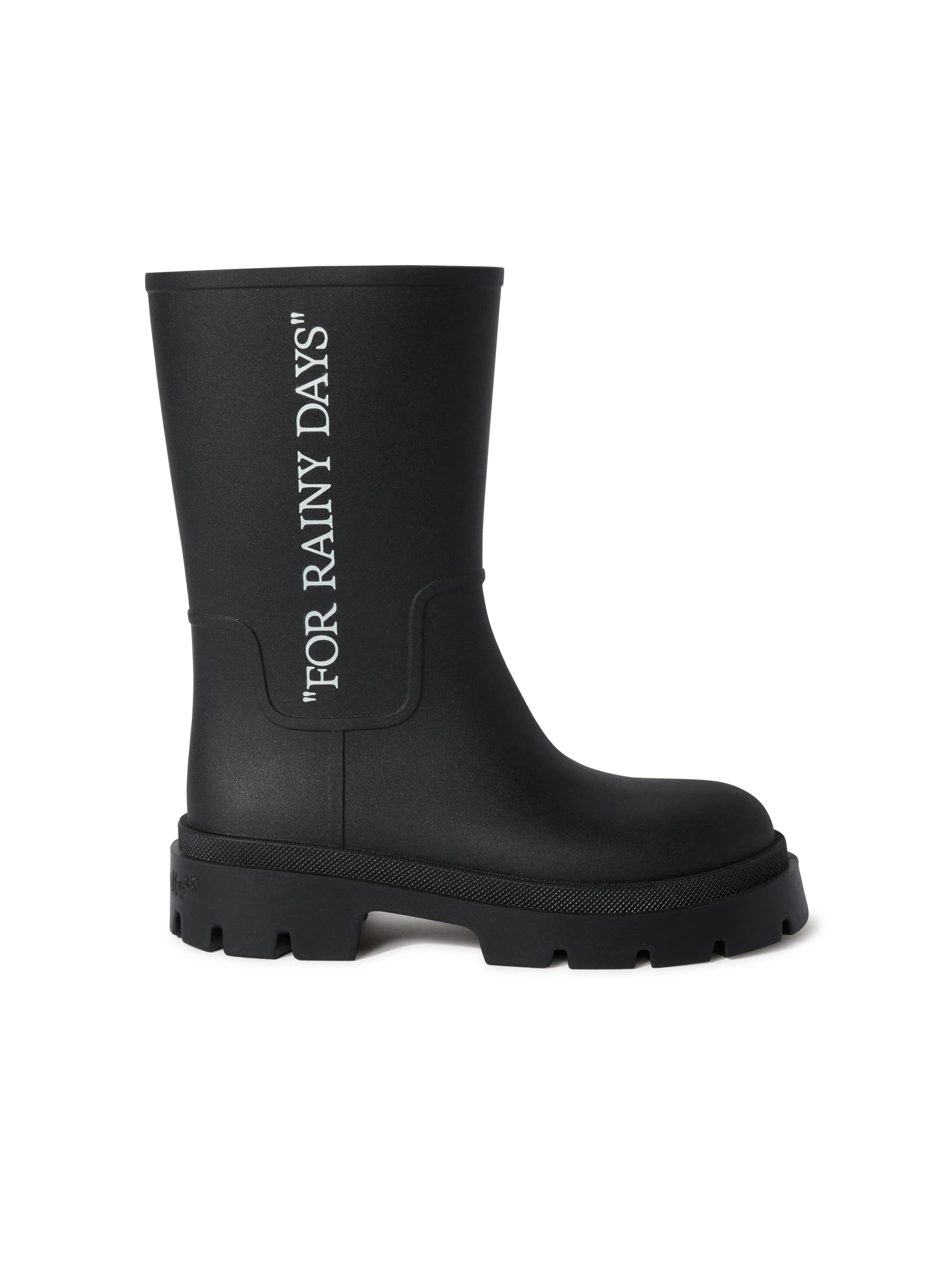 These PVC rain boots feature a signature quote. Made in Italy. DETAILS - Model Yi Xiang wears size 39 Height: 5' 8'' (177 cm) Chest: 30'' (77 cm) Waist: 25” (60 cm) Hips: 34.5'' (88 cm) - Materials:LINING:PVC 100%, OUTER:PVC 100%, LINING:Polyester 100% - Code: OWIE049C99MAT0011001