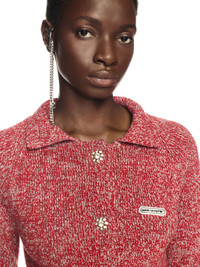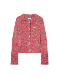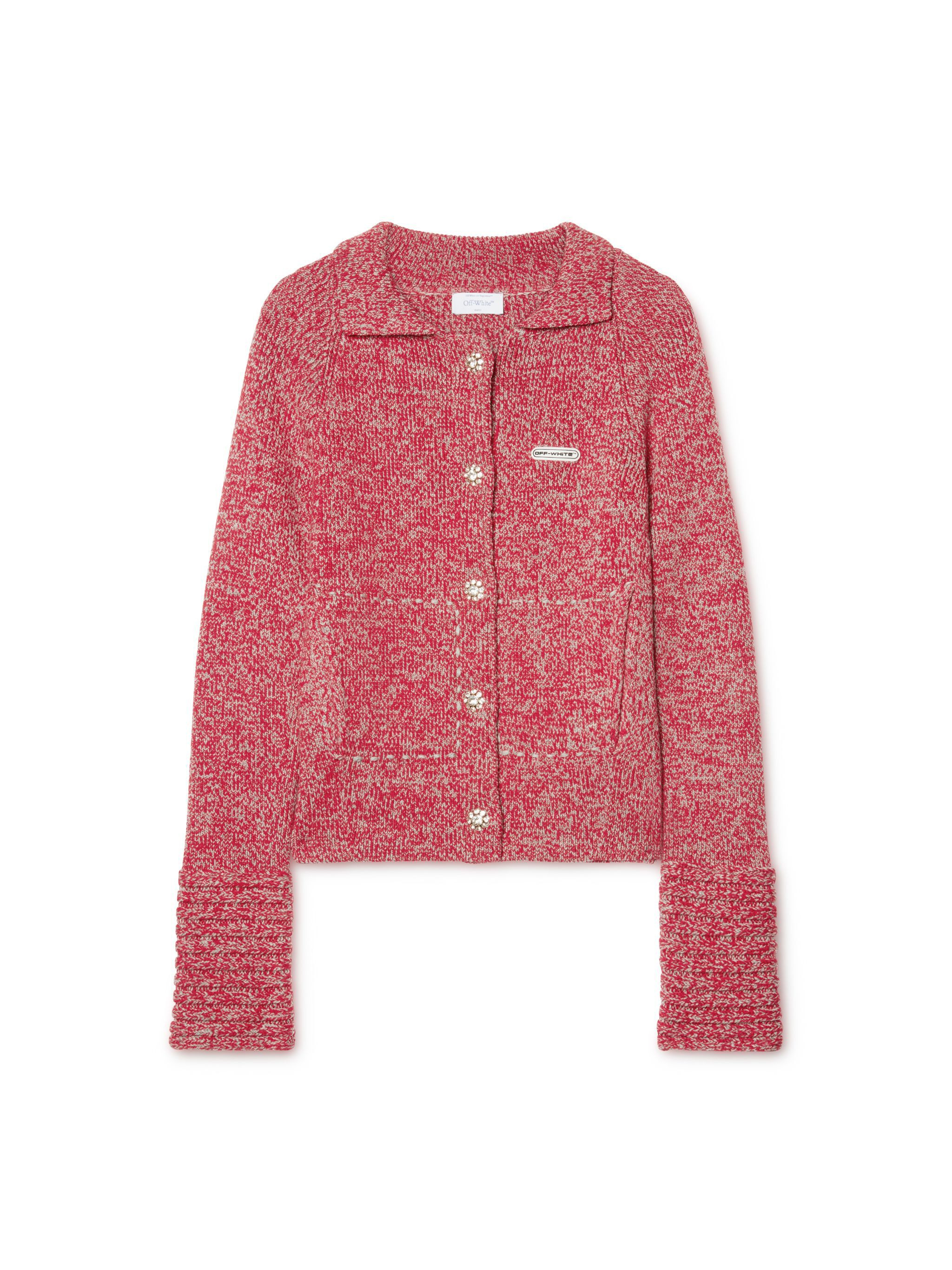 This 100% wool knit jacket features a small silicon logo patch and jewel buttons. Made in Italy. As seen in the Fall Winter 2024 Show entitled "Black by Popular Demand". MATERIALS 100% Wool FITTING DIARA WEARS SIZE S HEIGHT: 5’ 11” (180 CM) BUST: 32” (82 CM) WAIST: 25” (63 CM) HIPS: 35” (90 CM)