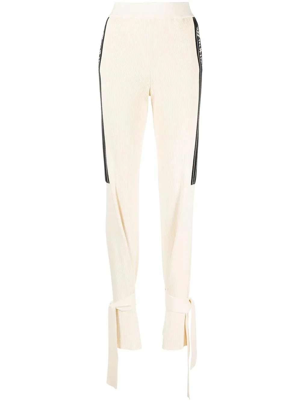rib-knit trousers Let's get comfortable. With a rib-knit design, these trousers from Off-White will ensure you look and feel your best. Relax in style. Made in Italy Composition Viscose 90%, Polyester 10% SIZE & FIT Model measurements Height 5 ft 10 in(1.77 m) Bust/Chest 32.67 in(83 cm) Hips 35.43 in(90 cm) Waist 23.62 in(60 cm) FittingInformation This piece fits true to size. We recommend you get your regular size Designed to be fitted at the waist and hips, loose over the leg Made with a mid-weight fabric Washing instructions Hand Wash
