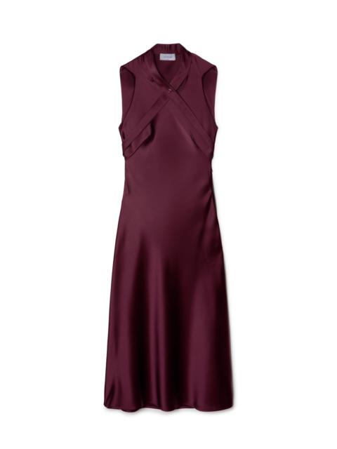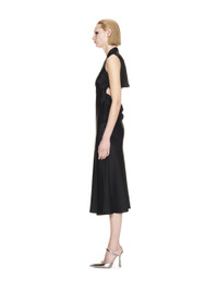 Black sleeveless long dress featuring crossed bands with tonal buttons at front. Regular fit. MATERIALS 17% Polyethylene 83% Triacetate FITTING Model Elisa Nijman wears size S Height: 5’ 8" (179 cm) Chest: 32“ (81 cm) Waist: 23” (60 cm)