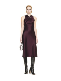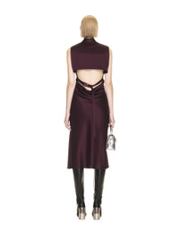 Bordeaux sleeveless long dress featuring crossed bands with tonal buttons at front. Regular fit. MATERIALS 17% Polyethylene 83% Triacetate FITTING Model Elisa Nijman wears size S Height: 5’ 8" (179 cm) Chest: 32“ (81 cm) Waist: 23” (60 cm)
