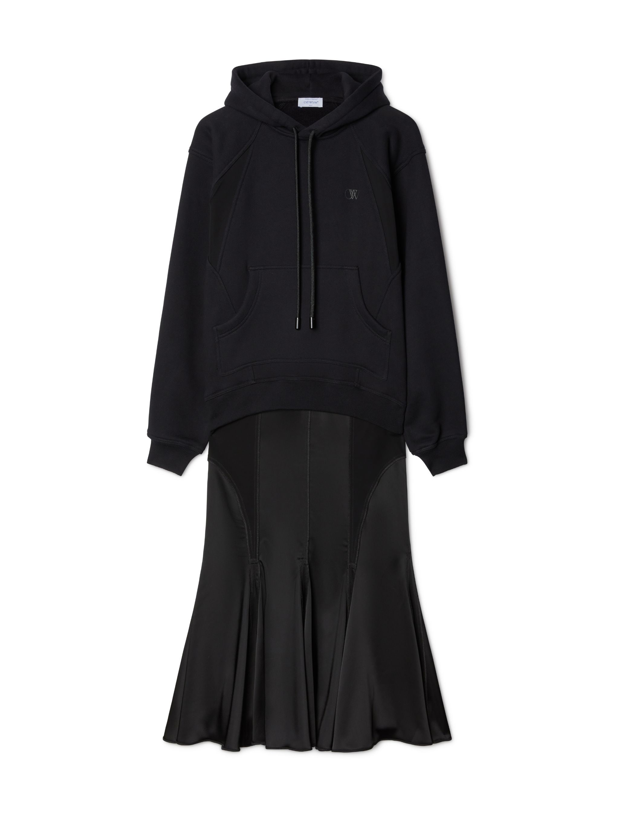 black cotton blend logo print at the chest drawstring hood front pouch pocket long sleeves ribbed cuffs flared skirt mid-length straight hem MATERIALS 100% Cotton 20% Viscose 77% Acetate 3% Elastane FITTING Bust 77cm Height 177cm Hips 89cm Waist 58cm