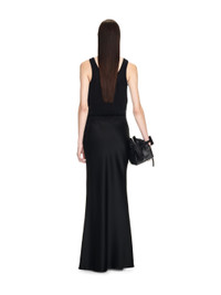 This slim fit dress is constructed with a net bodice, lace inserts at the waist and a floor-length satin skirt. Made in Italy. MATERIALS 100% Cotton FITTING Model Lydia Celesta wears size 40 Height: 5’ 10" (178 cm) Waist: 23” (58 cm) Hips: 34” (88 cm)
