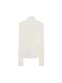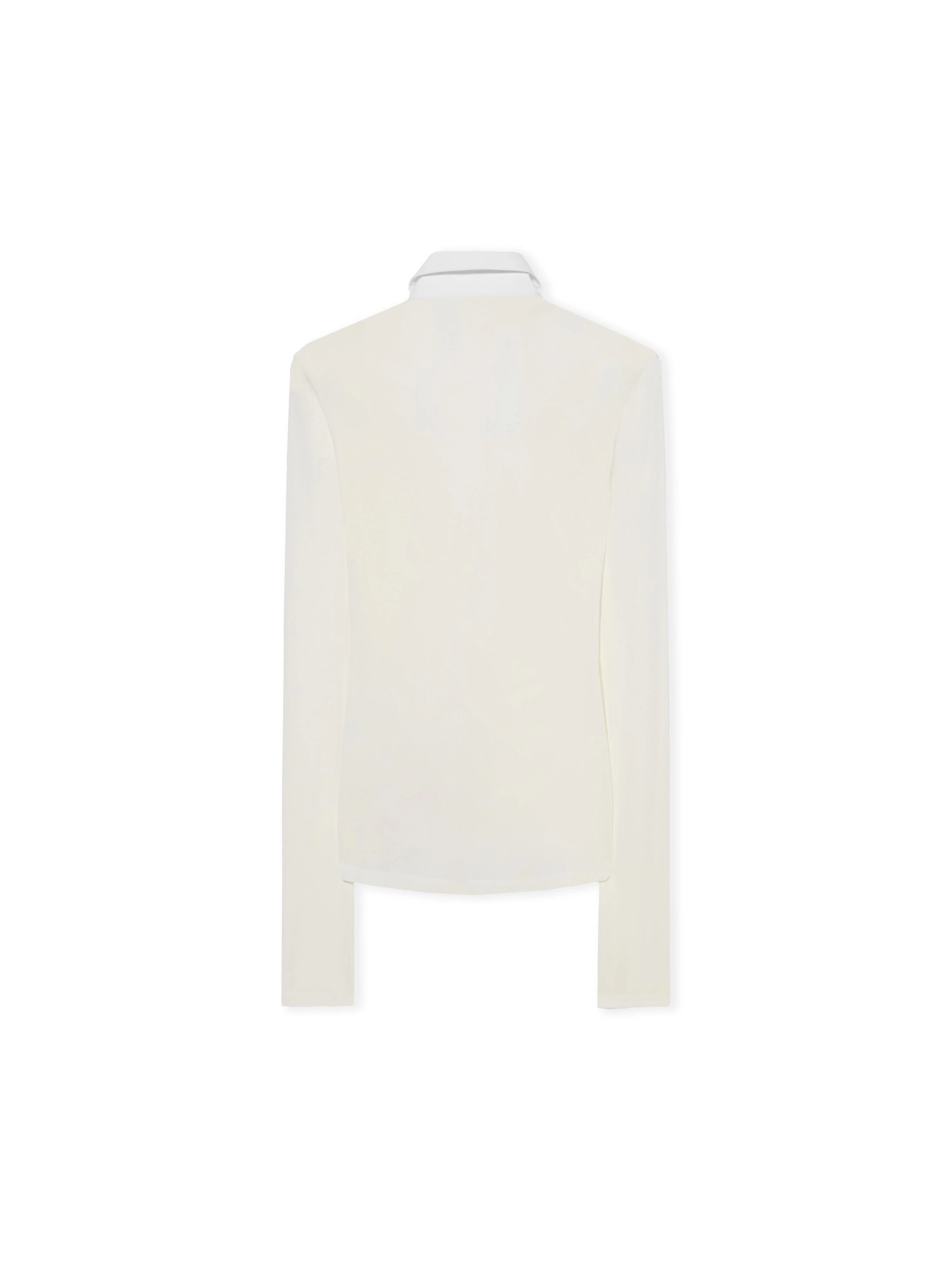 Experience a harmonious blend of elegance and urban sophistication with the Skin Long Sleeve Shirt, crafted from a refined fabric for a seamless silhouette. - Meticulously tailored for a slim fit - Classic pointed collar - Button-up front fastening - Long sleeves with extended cuffs - Subtle embroidered logo detail - Streamlined side seams - Minimalist back construction - Smooth hem finish - Made in Italy DETAILS - Material: 5% Elastane 95% Viscose - Code: OWGE02MF25JER0010101
