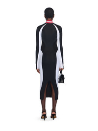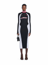 The Tech Jersey Midi Dress exemplifies Off-White™'s fusion of urban style and technical precision. Crafted in a form-fitting silhouette, it features a high neckline with a distinctive zip fastening, accentuated by the brand's signature logos and contrasting panels for a dynamic visual impact. - High neckline with zip fastening - Long sleeves for a streamlined silhouette - Contrasting side panels enhancing form - Signature Off-White™ logos at front - Seam detailing at rear for structural integrity DETAILS - Material: 14% Elastane 86% Polyester, Material: 2 22% Elastane 78% Polyamide (Nylon), Rib Details: 5% Elastane 95% Cotton - Code: OWDB558F25JER0011001