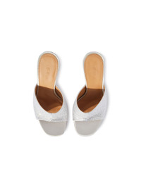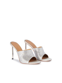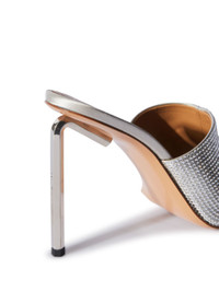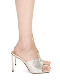 Lifted by the signature Allen Key heel, these shiny mules are made from 100% leather with a crystal-embellished silk upper. The heel is 100 mm. Made in Italy. MATERIALS Outer: 28% Silk Lining: 100% Leather Sole: 100% Leather Outer: 72% Viscose FITTING Heel Height: 100 mm