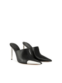 Black pointed mules featuring silver heels and silver details at front. Tonal Off-White logo at front. MATERIALS Outer: 100% Leather Lining: 100% Leather Sole: 100% Leather FITTING Bust 0cm Height 0cm Hips 0cm Waist 0cm