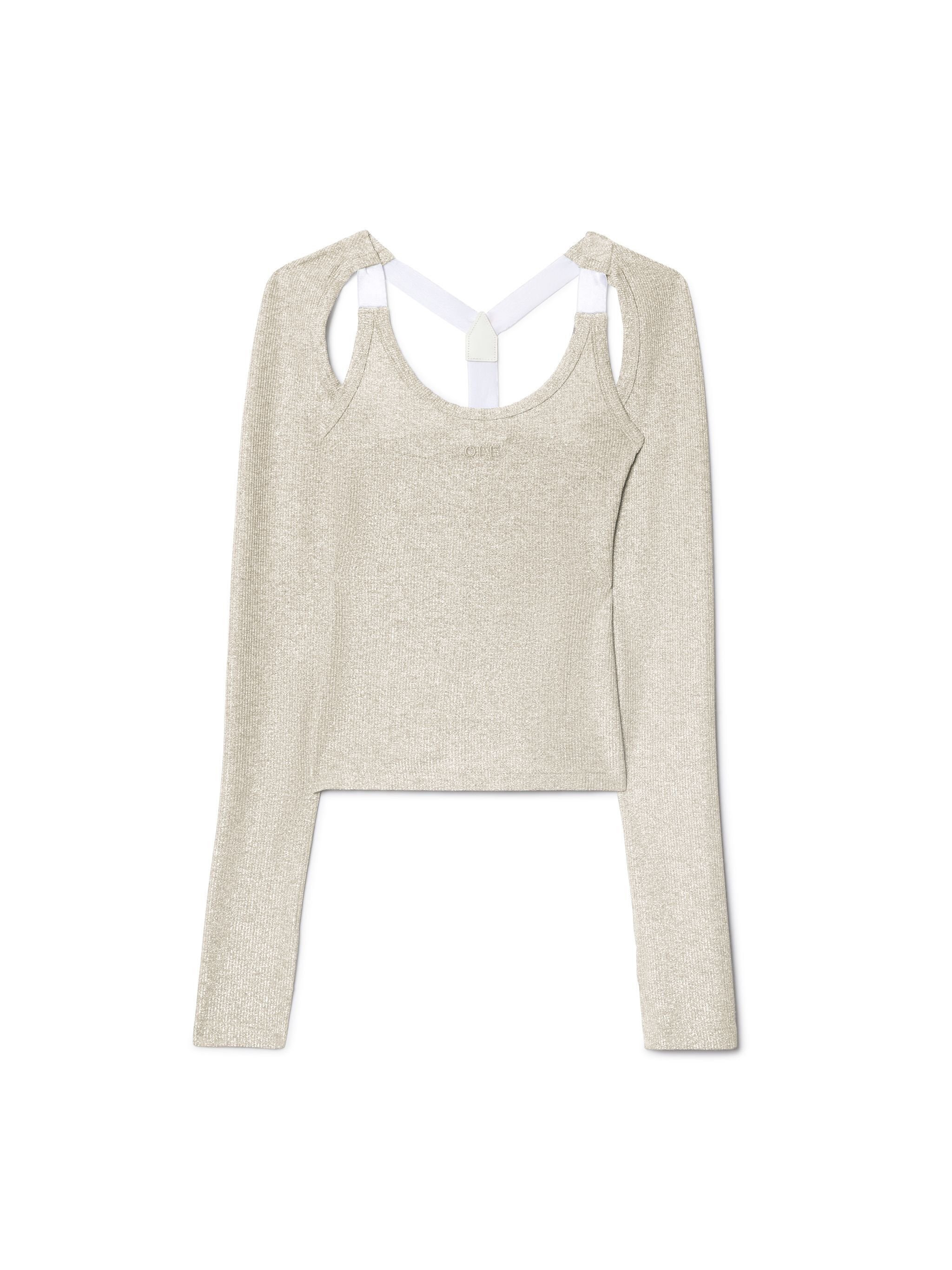 This lurex long-sleeved backless top has a metallic ribbed finish and features a small stamp logo. The contrasting suspender-style straps host a metal arrow logo plaque on the reverse. Close fit. DETAILS - BETTY WEARS SIZE 38 HEIGHT: 5' 9” (179 CM) BUST: 30” (76 CM) WAIST: 24“ (60 CM) HIPS: 34” (87 CM) - Materials:Polyamide 11%, Spandex/Elastane 2%, viscose 76%, metal 11% - Code: OWAD25ZS25JER0027272