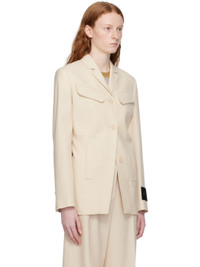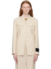 Virgin wool twill blazer. · Notched lapel · Button closure · Flap and welt pockets · Padded shoulders · Two-button surgeon's cuffs · Velcro logo patch at cuff · Adjustable strap at back · Full twill lining Supplier color: Sand Body: 100% virgin wool. Lining: 53% viscose, 47% cupro. Made in Italy 231607F057000