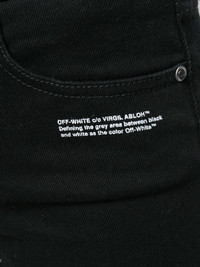 skinny leg jeans Founded in 2013 by DJ and fashion designer Virgil Abloh, the Milan based fashion label Off-White was conceived to link the gap between streetwear and high fashion, as seen in these vintage black stretch cotton skinny leg jeans. Featuring belt loops, a front button fastening, a five pocket design, a contrasting white and yellow printed scarf detail at the front and a contrasting white lettering logo print on the front. Made in Italy Composition Outer: Cotton 98%, Spandex/Elastane 2% Lining: Polyester 65%, Cotton 35% SIZE & FIT Model measurements Height 5 ft 10 in(1.78 m) Bust/Chest 31.49 in(80 cm) Hips 36.22 in(92 cm) Waist 25.59 in(65 cm) Measurement FRONT RISE 9.05 in(23 cm) INSIDE LEG 31.1 in(79 cm) BACK RISE 12.99 in(33 cm) HIPS 33.85 in(86 cm) WAIST 27.55 in(70 cm) FittingInformation This piece fits true to size. We recommend you get your regular size Cut for a slim fit Made with a mid-weight fabric Washing instructions Machine Wash