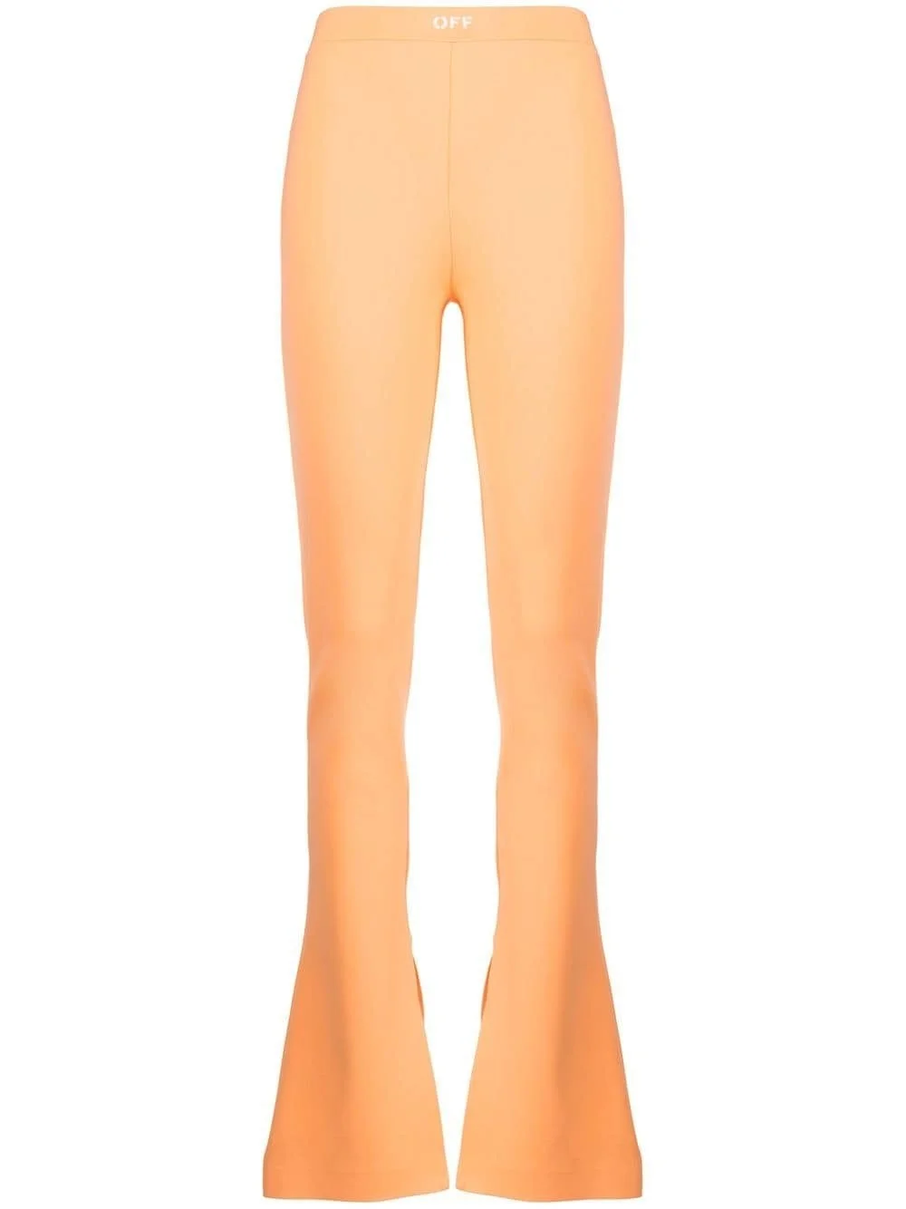 Sleek flared trousers Off-White offers bold contemporary style with these trousers. Imagined in a bright peach orange hue, they are detailed with side slits for a modern finish. Made in Italy Composition Polyamide 86%, Spandex/Elastane 14% SIZE & FIT Model measurements Height 5 ft 10 in(1.79 m) Bust/Chest 31.1 in(79 cm) Hips 35.03 in(89 cm) Waist 24.01 in(61 cm) FittingInformation This piece fits true to size. We recommend you get your regular size Designed to be fitted at the waist and through the thigh, loose from the knee Made with a mid-weight stretch fabric Washing instructions Machine Wash