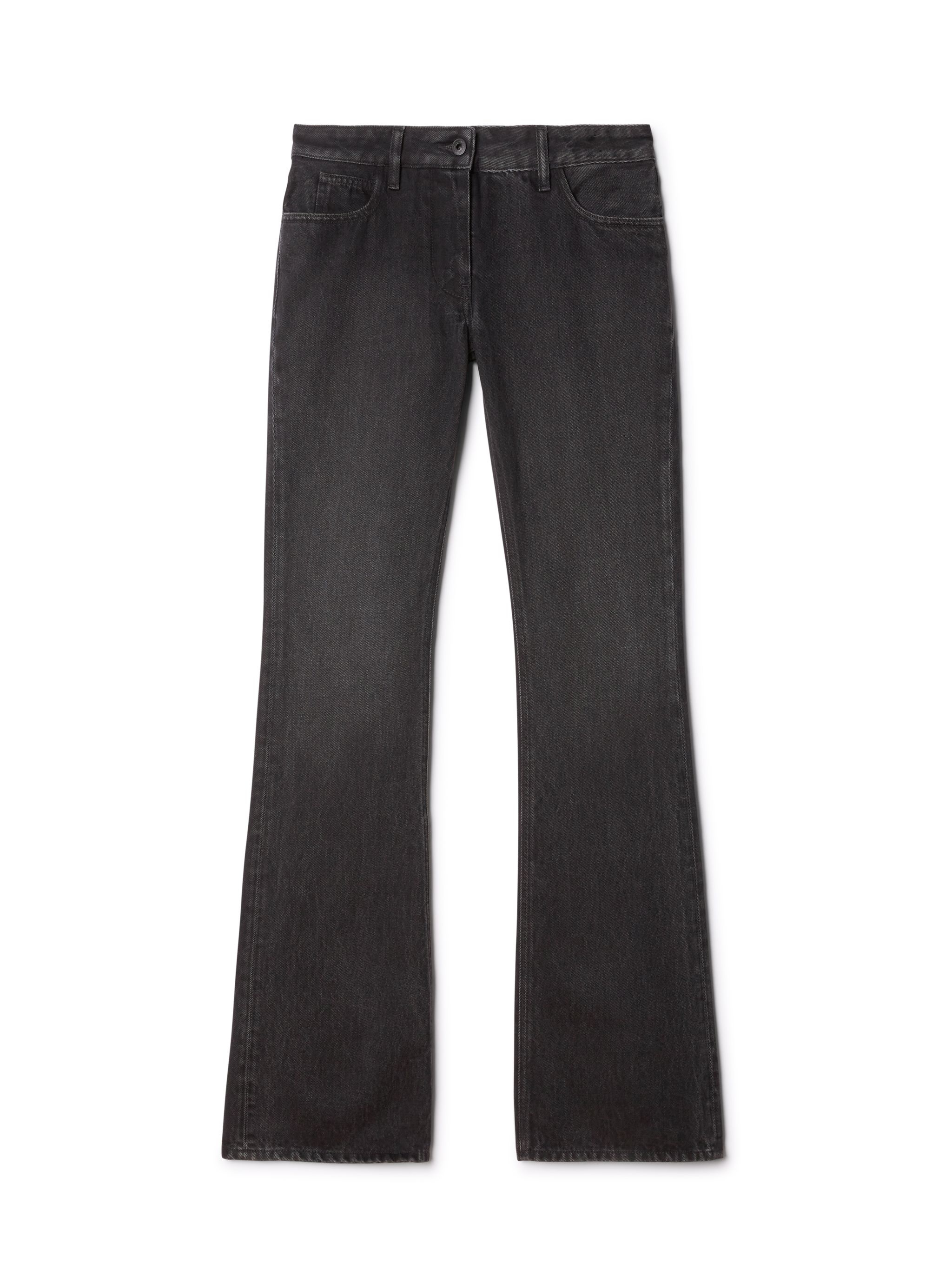 Dark Denim flared pant with two pockets at side.Frontal button closure.Slim fit MATERIALS Outer: 100% Cotton Lining: 100% Cotton FITTING Model Mariama Balde wears size 40 Height: 5’ 11" (180 cm) Waist: 23” (60 cm) Hips: 35” (89 cm)