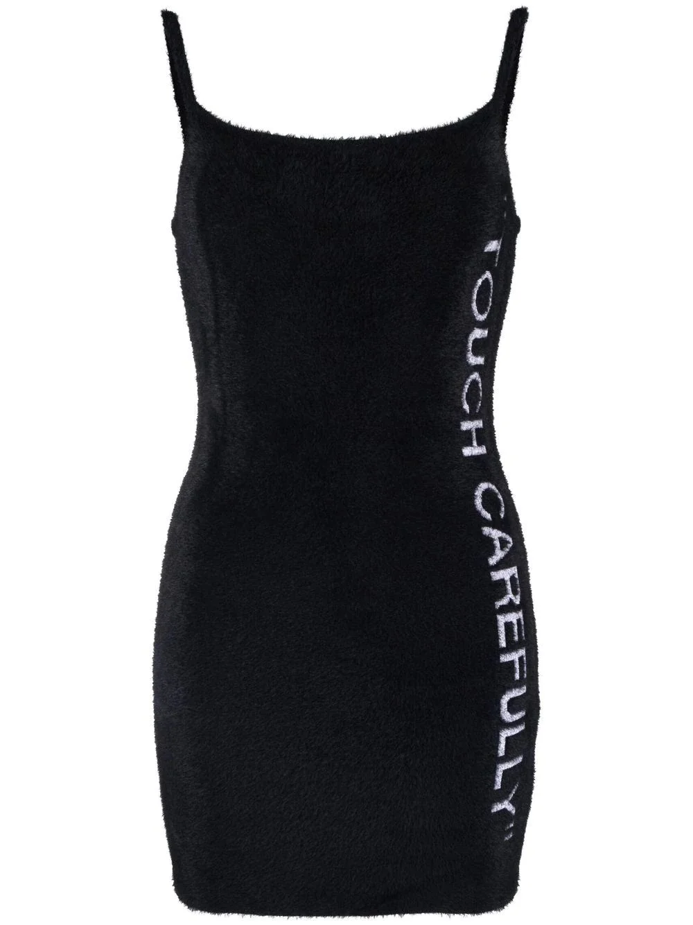 slogan detail fuzzy mini dress Off-White takes classic silhouettes and updates them with refreshing details. A fine example, this knitted dress is accented with a Touch Carefully slogan and completed with a fuzzy effect that adds a modern flair to the piece. Made in Italy Composition Polyamide 97%, Wool 2%, Polyurethane 1% SIZE & FIT Model measurements Height 5 ft 10 in(1.79 m) Bust/Chest 31.1 in(79 cm) Hips 35.03 in(89 cm) Waist 24.01 in(61 cm) FittingInformation This piece fits true to size. We recommend you get your regular size Cut for a close fit Made with a mid-weight fabric Washing instructions Dry Clean Only