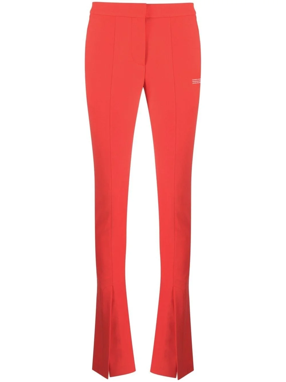 split-hem flared trousers Designed in a bold red hue and with a stretch construction, these tailored trousers encapsulate Off-White's statement streetwear aesthetic. Highlights - Bright red - Stretch-wool - Slogan print to the side - Mid-rise - Concealed front fastening - Two side slit pockets - Flared hem - Split cuffs - Floor-length Made in Italy Composition Outer: Recycled Polyester 53%, Virgin Wool 43%, Spandex/Elastane 4% Lining: Cotton 100% SIZE & FIT Model measurements Height 5 ft 10 in(1.77 m) Bust/Chest 32.67 in(83 cm) Hips 35.43 in(90 cm) Waist 23.62 in(60 cm) FittingInformation This piece fits true to size. We recommend you get your regular size Cut for a close fit Made with a mid-weight stretch fabric Washing instructions Dry Clean Only