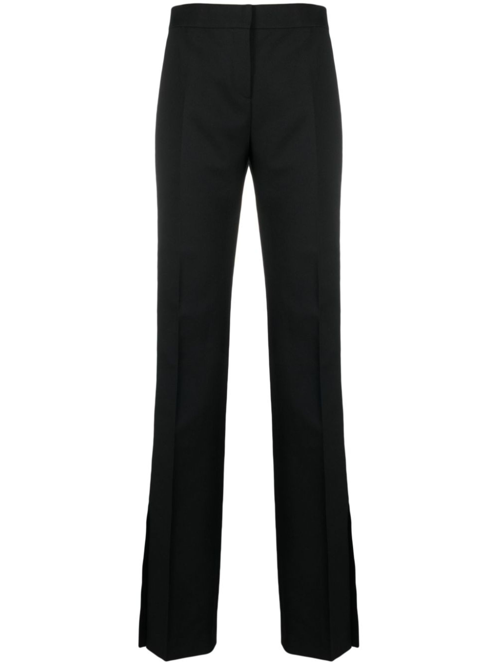 split-hem tailored trousers from OFF-WHITE featuring black, satin trim, high-waisted, side hook and eye fastening, concealed side zip fastening, pressed crease, two rear jetted pockets, straight leg and side slits. Size & Fit Model Measurements: Height: 1.78 m Bust/Chest: 86.0 cm Hips: 91.0 cm Waist: 57.0 cm Model wears size 40 Fabric and Care Designer Style ID: OWCQ002F23FAB0011010 Designer Colour: 1010 BLACK BLACK Composition: Outer: Acetate 77%, Elastane 3%, Polyester 100%, Viscose 20%; Lining: Cotton 100% Washing instructions: Dry Clean Only Made in Italy