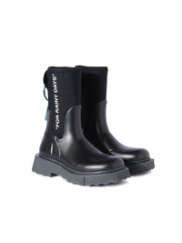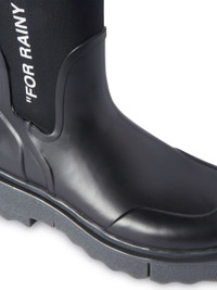 Black rubber rain boots featuring "FOR RAINY DAYS" at side. Mid-calf length and tonal rubber sole. MATERIALS Outer: 100% Rubber Sole: 100% Rubber Outer: 100% Fabric Lining: 100% Fabric FITTING Bust 0cm Height 0cm Hips 0cm Waist 0cm