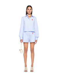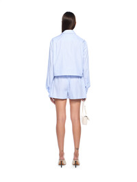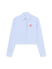 Experience refined urbanity with the Striped Poplin Shirt, featuring distinctive tailoring and emblematic detailing. - Smooth poplin construction - Buttoned collar and cuffs - Signature logo embroidery on the chest - Concealed front placket - Structured rear yoke - Relaxed silhouette - Made in Italy DETAILS - Material: 100% Cotton - Code: OWGE02AF25FAB0014026