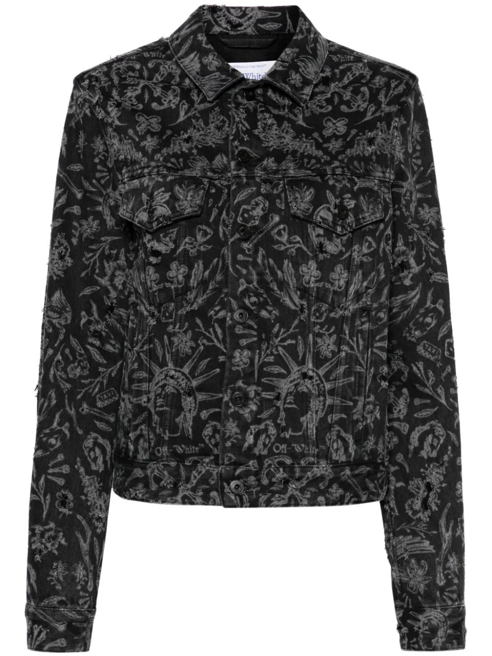 Tattoo distressed denim jacket Off-White's take on a classic denim jacket is printed with a tattoo-inspired print throughout. Highlights - Black - Cotton - Denim - Distressed finish - All-over faded tattoo print - Logo patch to the rear - Spread collar - Front button fastening - Long sleeves - Buttoned cuffs - Two button-fastening chest pockets - Two side slit pockets - Adjustable side straps - Straight hem - Unlined Made in Italy Composition Cotton 100% Washing instructions Machine Wash