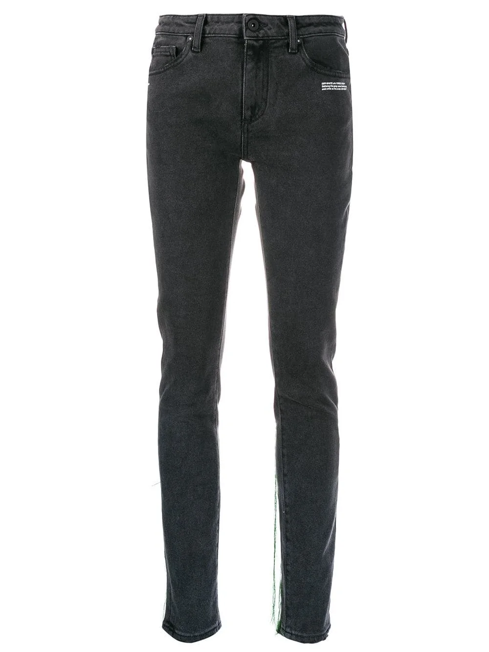 thread trim jeans Full of surprises season after season, Off-White uses bold graphic logos and mash-up iconography ranging from Renaissance paintings, racing stripes to embroidered floral motifs to create statement-provoking luxury streetwear such as these dark grey thread trim jeans. Featuring a button and zip fly, belt loops, a five pocket design and a printed logo to the front. Made in Italy Composition Outer: Cotton 100% Lining: Cotton 100% SIZE & FIT Model measurements Height 5 ft 9 in(1.74 m) Bust/Chest 32.67 in(83 cm) Hips 35.43 in(90 cm) Waist 23.62 in(60 cm) FittingInformation This piece fits true to size. We recommend you get your regular size Cut for a slim fit Made with a mid-weight stretch fabric Washing instructions Hand Wash