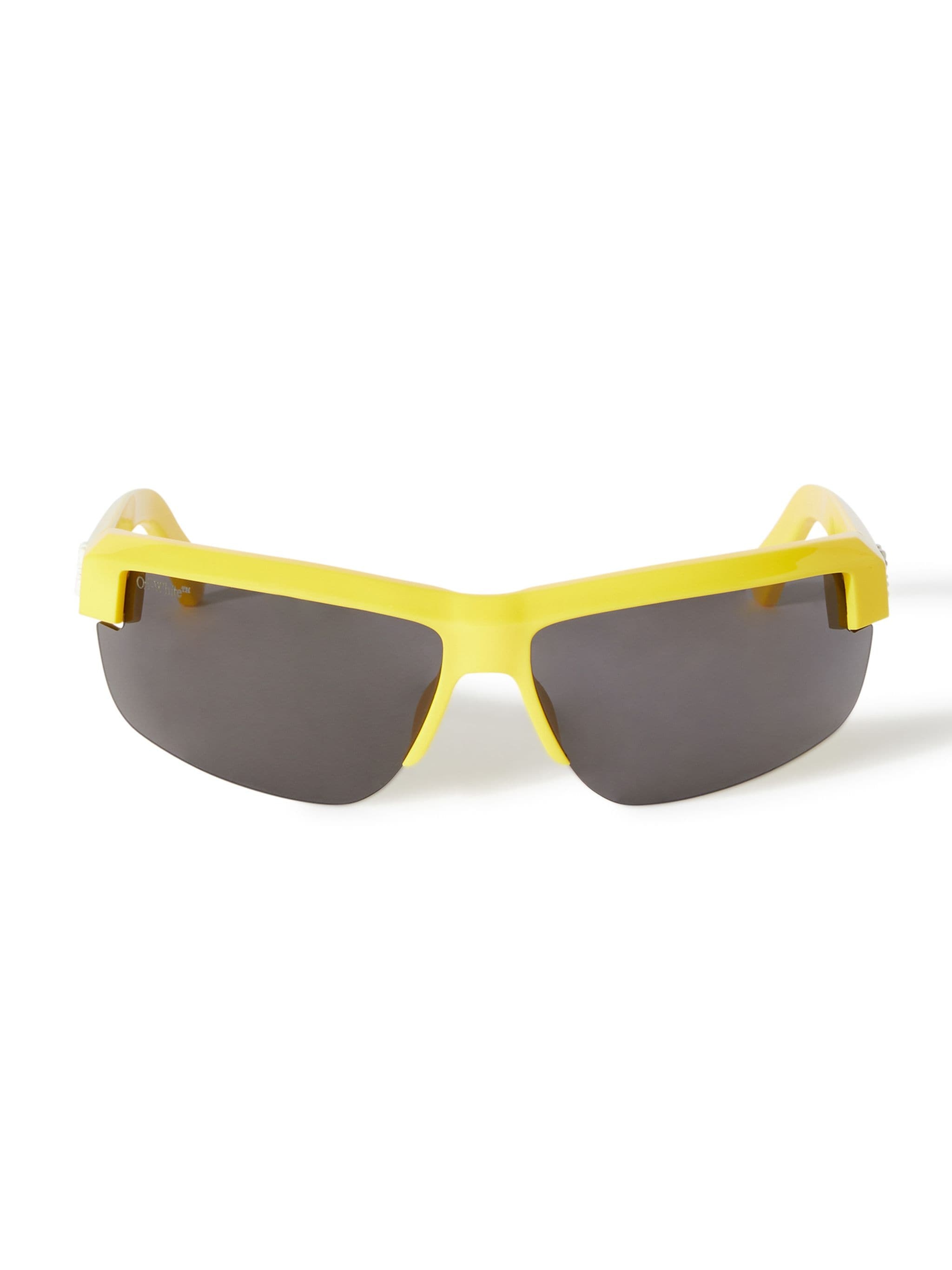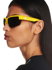 Yellow sunglasses featuring white arrows at side. Rectangular shape and dark green lens. Logo engraved on the lens. MATERIALS 100% Acetate FITTING Bust 0cm Height 0cm Hips 0cm Waist 0cm