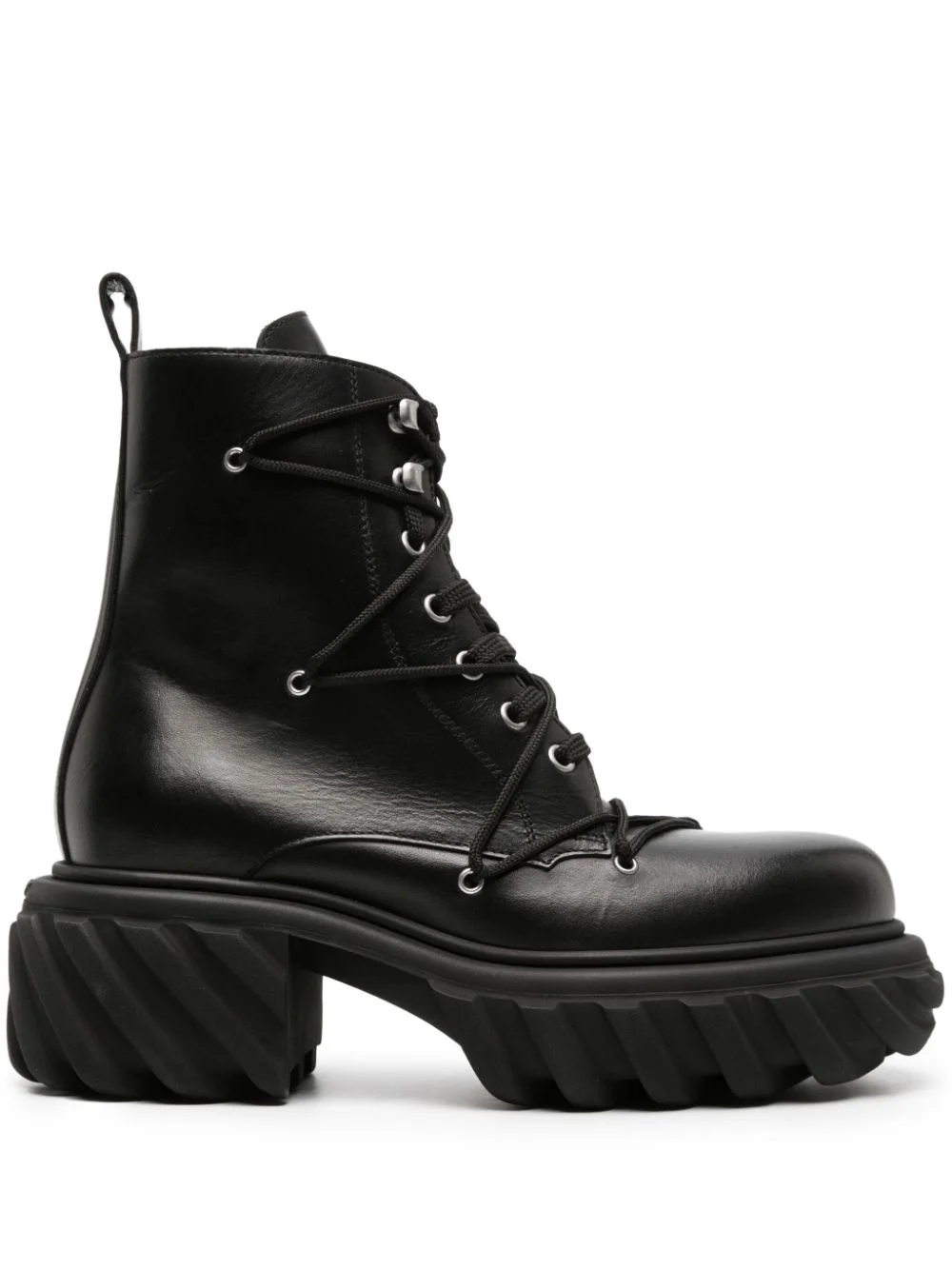 Tractor Motor leather boots Off-White showcases its penchant for distinctive details in these Tractor Motor leather boots. The silhouette is enhanced with a double lace-up fastening, while the rubber sole boasts the brand's signature chunky treads. Highlights - Black - Calf leather - Front lace-up fastening - Round toe - Pull-tab at the heel - Chunky rubber sole - Ankle-length Made in Italy Composition Leather 100% SIZE & FIT Measurement HEEL 2.55 in(6.5 cm) HEIGHT 6.29 in(16 cm) PLATFORM 1.57 in(4 cm)