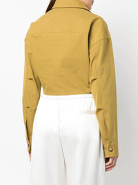 twist-front cropped cargo shirt Highlights - Moss green - Organic cotton blend - Twist detailing - Classic collar - Two chest patch pockets - Drop shoulder - Long sleeves - Buttoned cuffs - Cropped Made in Italy Composition Organic Cotton 83%, Polyamide 17% SIZE & FIT Model measurements Height 5 ft 10 in(1.78 m) Bust/Chest 33.07 in(84 cm) Hips 35.82 in(91 cm) Waist 26.96 in(68.5 cm) FittingInformation This piece fits true to size. We recommend you get your regular size Cut for a loose fit Made with a mid-weight non-stretch fabric