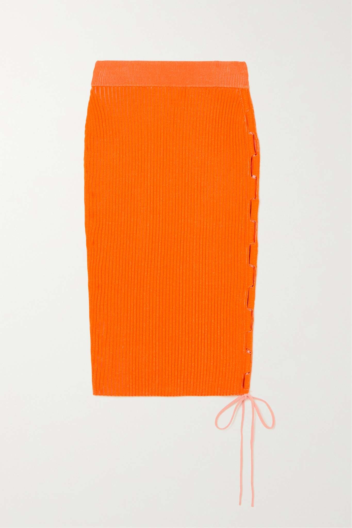 EDITORS'NOTES Off-White's 'Vanise' midi skirt is designed to beautifully accentuate your natural curves. It's rib-knitted from 'Coral Red' yarns and detailed with lacing along one side to reveal a flash of skin. Balance the high-rise waistband with a cropped tank. SIZE & FIT - Fits true to size, take your normal size - Falls below the knee, designed to be worn at the waist - Ties at the side for an adjustable fit - Mid-weight knit - Model is 177cm/ 5'10" and is wearing an IT 40 DETAILS & CARE - Orange ribbed-knit - Slips on - 82% viscose, 18% polyester - Machine wash or dry clean - Designer color: Coral Red