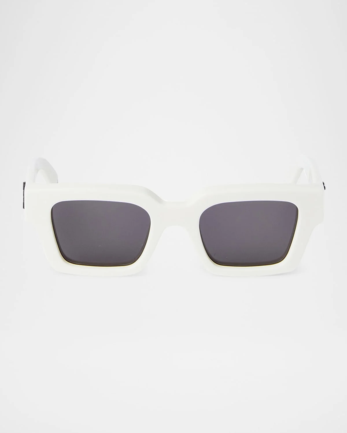 - Off-White "Virgil" square sunglasses in acetate - Eye/bridge/temple (in mm): 50-22-145 - Solid lenses - Saddle nose bridge - Thin, tapered arms - Arrow detail at temples - Acetate - 100% UVA/UVB protection - Made in Italy - Proposition 65 warning for California residents
