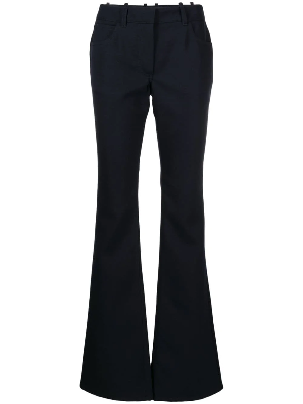 virgin wool flared trousers Spun in Italy from delicate virgin wool, these cobalt blue trousers from Off-White reveal the brand's contemporary take on tailored styles. They're cut to a low-waist flared silhouette whilst boasting tonal stitching throughout. Highlights - Cobalt blue - Virgin wool - Low-rise - Concealed front fastening - Belt loops - Classic five pockets - Flared Made in Italy Composition Outer: Virgin Wool 100% Lining: Cotton 100% SIZE & FIT Model measurements Height 5 ft 9 in(1.75 m) Bust/Chest 31.49 in(80 cm) Hips 34.05 in(86.5 cm) Waist 24.21 in(61.5 cm) FittingInformation Designed with a flared hem, these trousers allow for a close fit at the waist with a slim fit over the leg and widening towards the hem Made from a midweight non-stretch fabric This piece fits true to size – take your usual size Washing instructions Dry Clean Only