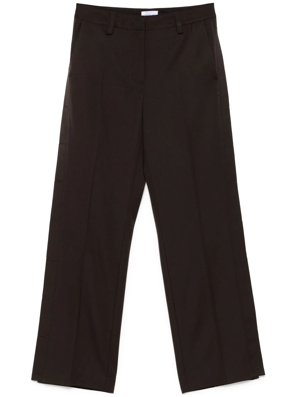 virgin-wool wide-leg trousers Highlights - Chocolate brown - Concealed front button, hook and zip fastening - Belt loops - Two side slash pockets - Two rear jetted pockets Made in Italy Composition Viscose 100%, Virgin Wool 100% SIZE & FIT Model measurements Height 5 ft 10 in(1.78 m) Bust/Chest 33.85 in(86 cm) Hips 36.61 in(93 cm) Waist 26.77 in(68 cm) FittingInformation Designed with a wide-leg cut, these trousers allow for a close fit at the waist and offer a loose and roomy fit over the leg Made from a midweight non-stretch fabric